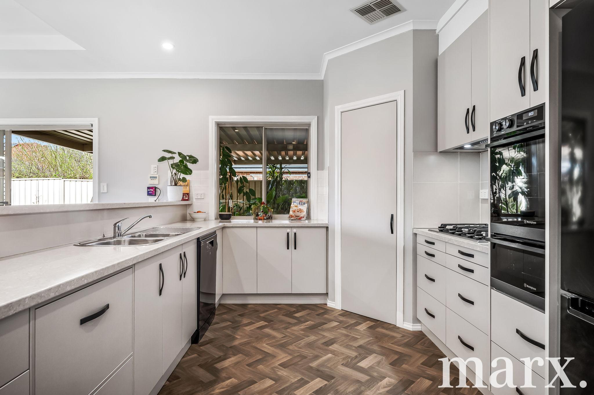At the heart of the home, the light-filled open plan kitchen, dining, and second living area creates a natural hub for everyday living. The kitchen showcases modern cabinetry with quality hardware, a Westinghouse double oven with pyrolytic technology, 5-burner gas cooktop, dishwasher, walk-in pantry, and provision for a double fridge. The adjoining lounge and dining space impresses with a vaulted ceiling, new blinds, and seamless access to the paved undercover entertaining area – an inviting setting for family gatherings or celebrations.