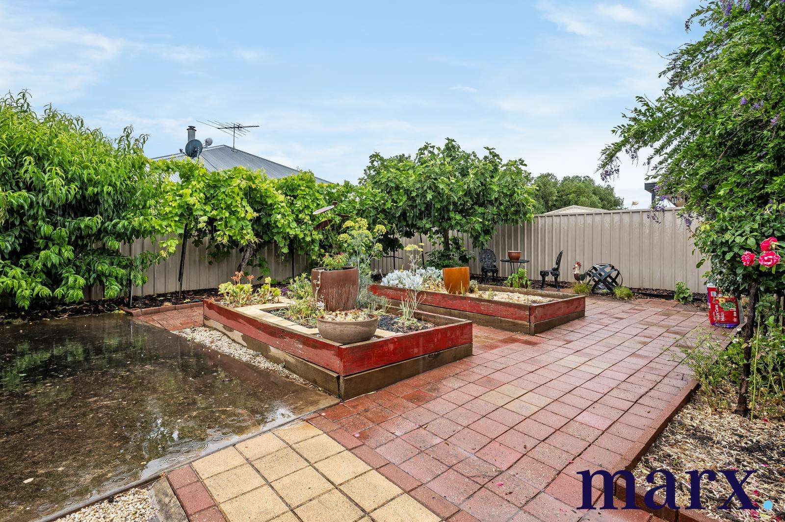 – The backyard hosts a variety of fruit trees, including fig, grapevine, and peacharine.
