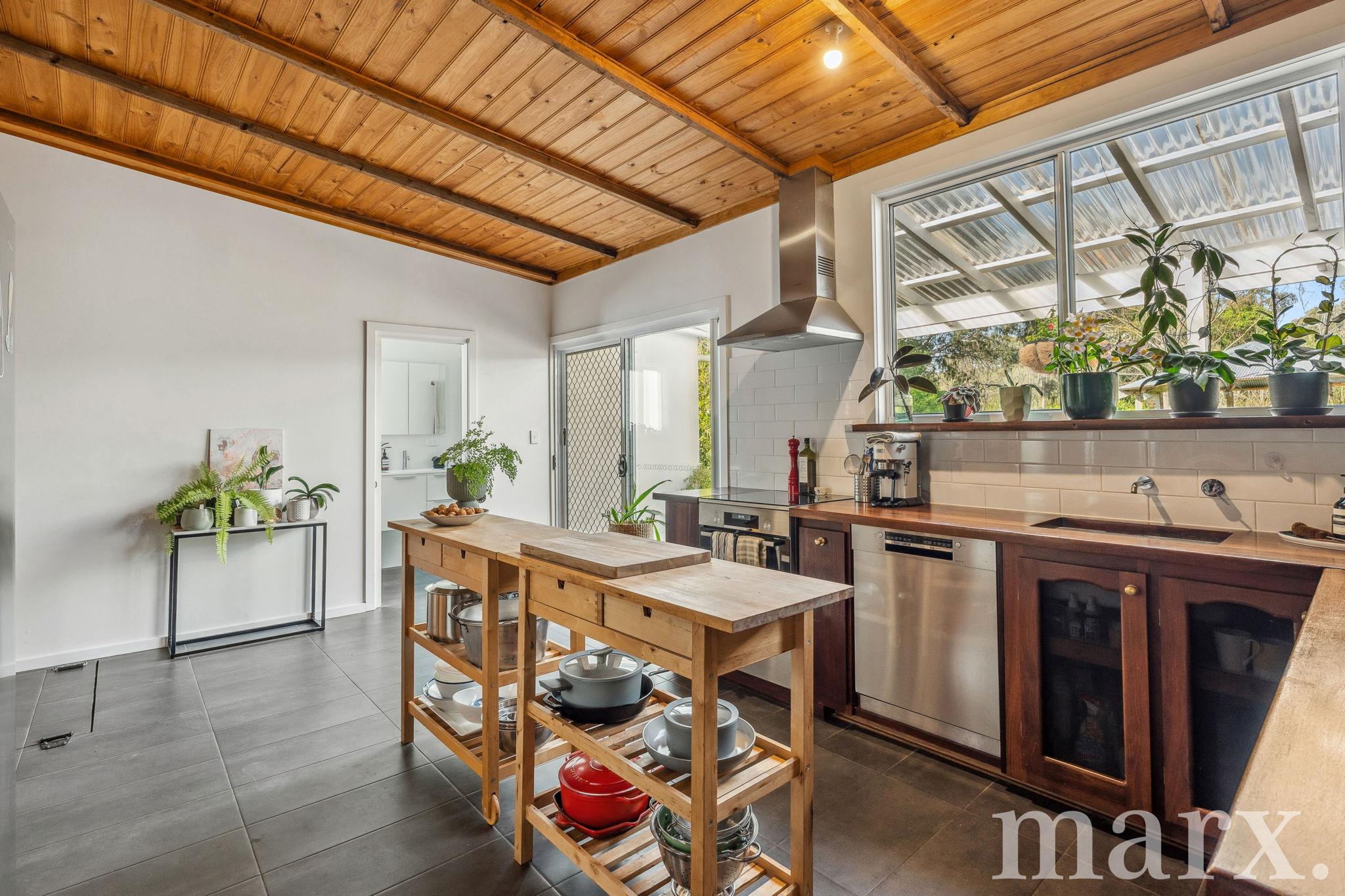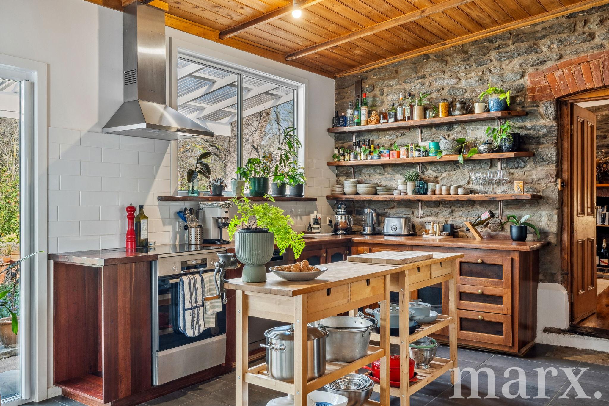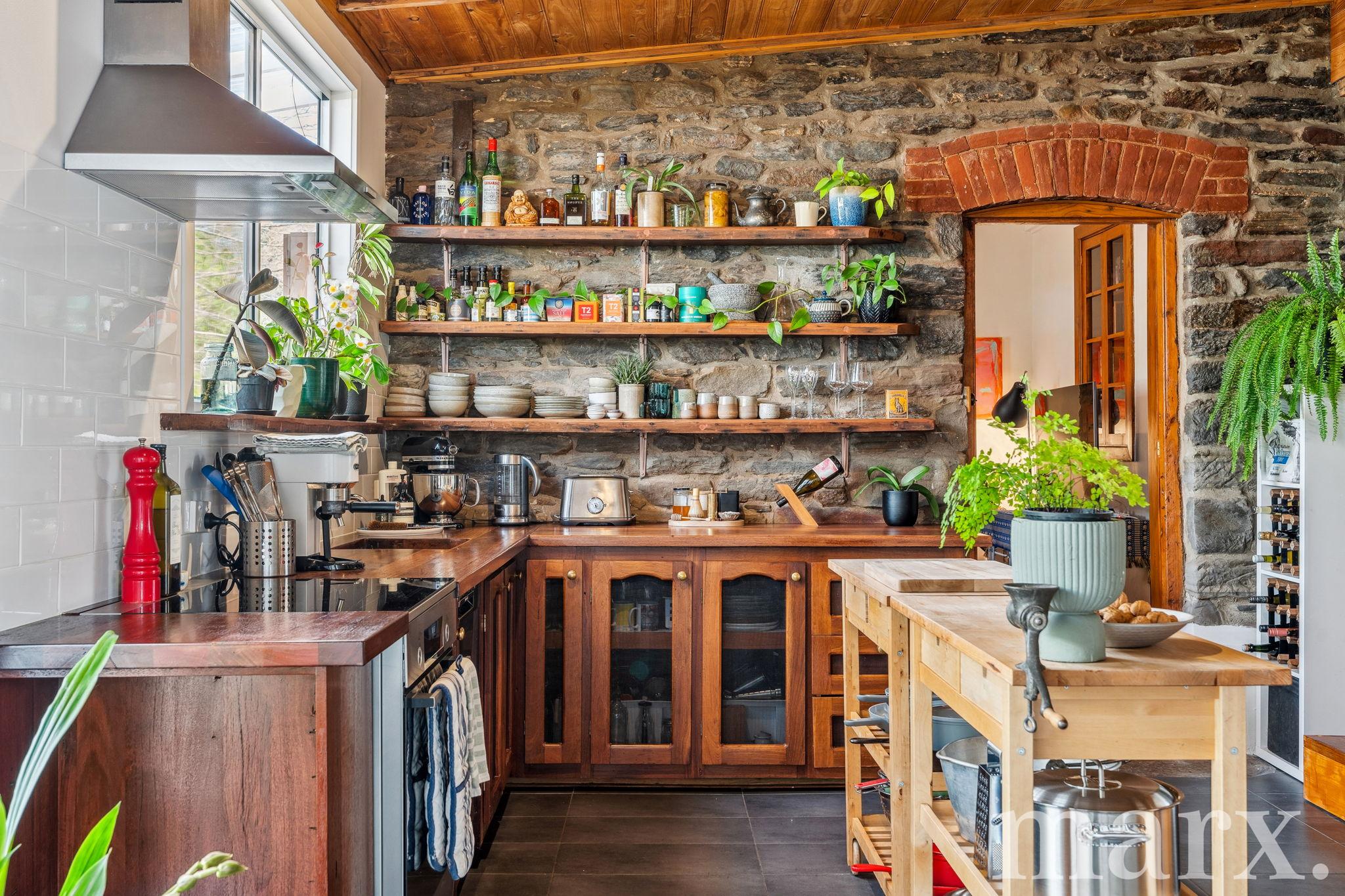– The kitchen has been modernised with Bosch appliances, including an electric oven with induction cooktop, rangehood, and dishwasher. Wooden benchtops and rustic shelving seamlessly blend into the home’s character.