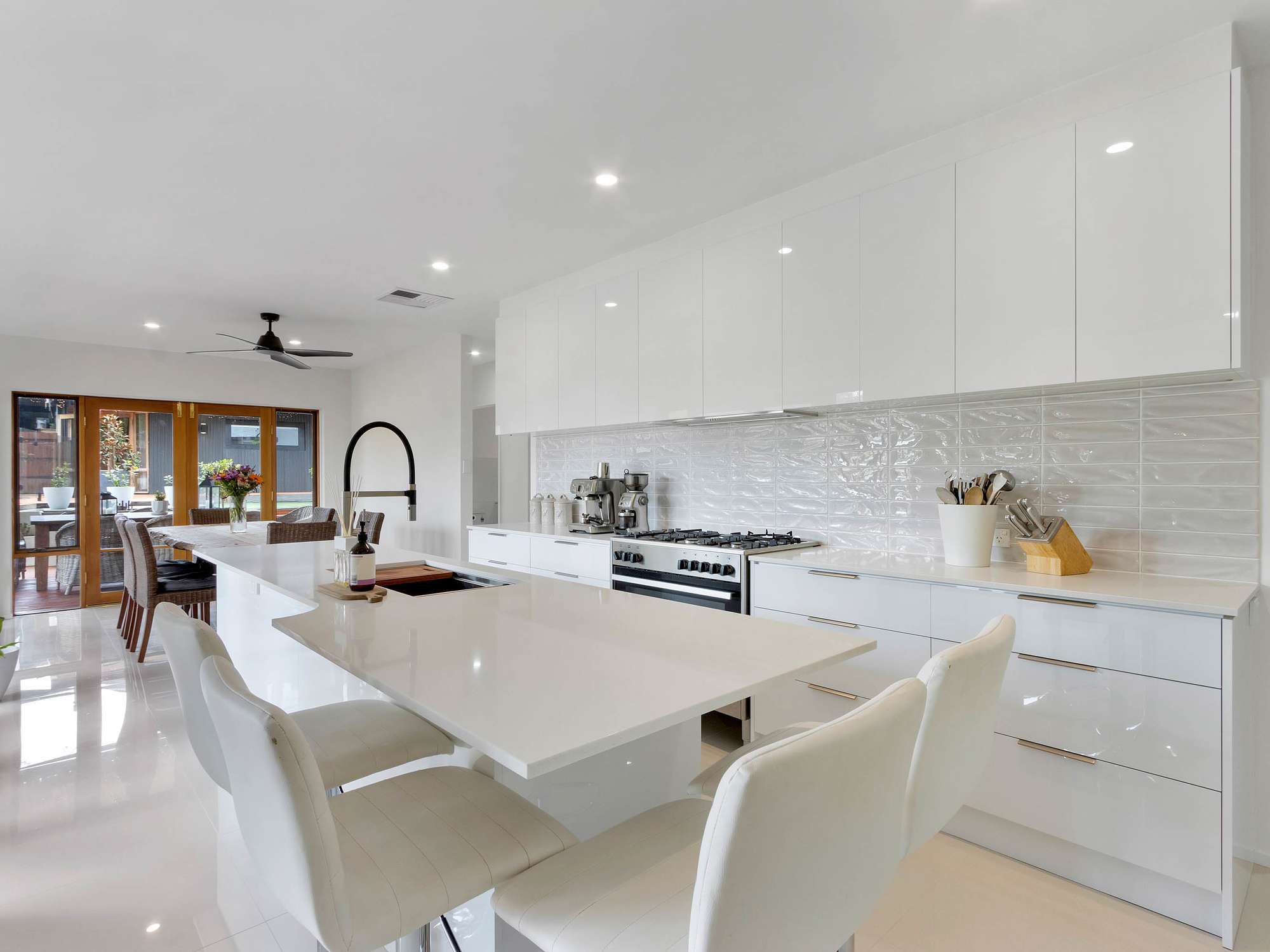 cupboards, 900ml Omega electric oven and 5 burner gas cook top. Large double sized sink, Smeg stainless steel dishwasher and butlers pantry (this area features stone benchtops, tiled splashback,